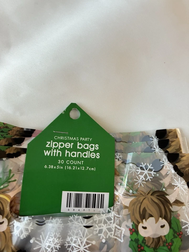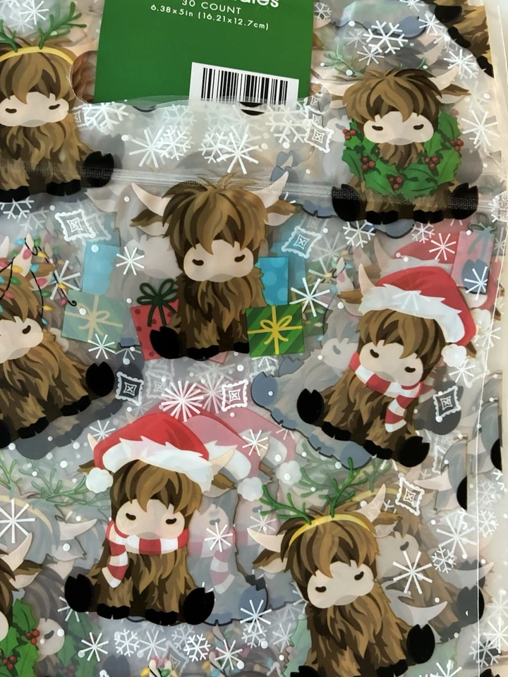 New Christmas Highland Cow Party Zipper Gift/Cookie Bags w/ Handles 30 Count